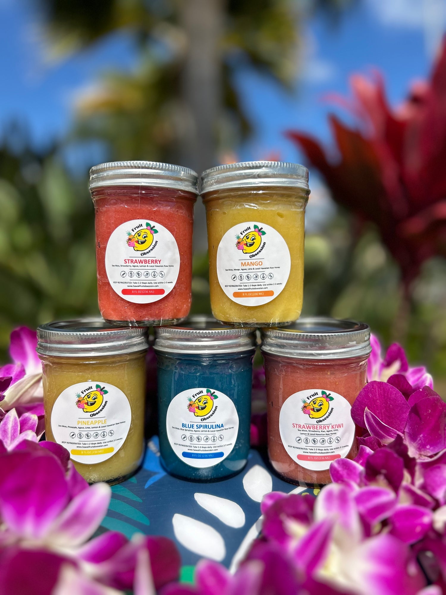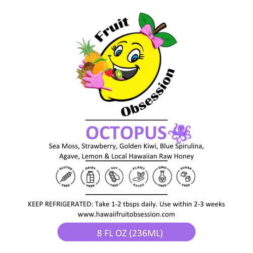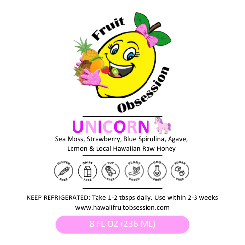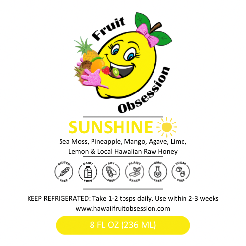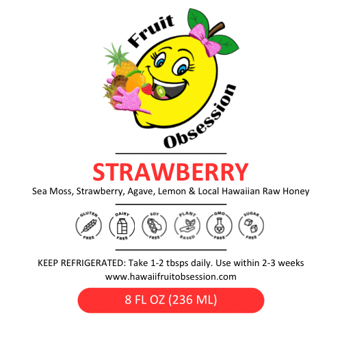 Irish Moss and is a type of seaweed that grows year round in of St. Lucia. It is packaged in the state of Georgia where it is tested for heavy metals and toxins. Sea moss gel is a natural, nutrient rich product derived from sea moss. The gel we create has a texture similar to jam or thick jello. Not gritty like apple sauce. Sea moss has a light fishy smell alone (it does come from the sea). Sea moss contains 92 of the 102 minerals the body needs. Here at Fruit Obsession, we purée with a main fruit and add lemon/lime, agave and local Hawaiian honey.